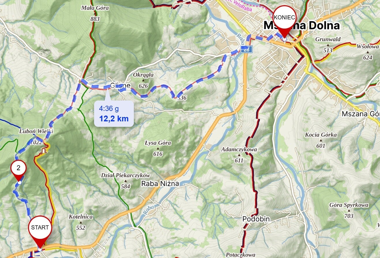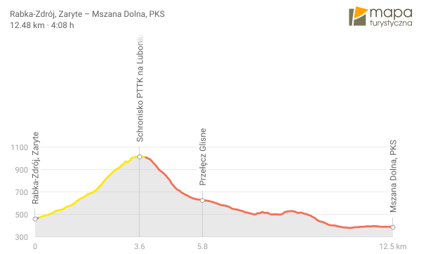 Rabka-Zdrój, Zaryte- szlakiem turystycznym niebieskim – Pod Luboniem - szlakiem turystycznym zielonym - Schronisko PTTK na Luboniu Wielkim - szlakiem turystycznym czerwonym (Mały szlak Beskidzki) - Glisne - szlakiem turystycznym czerwonym – Mszana Dolna
