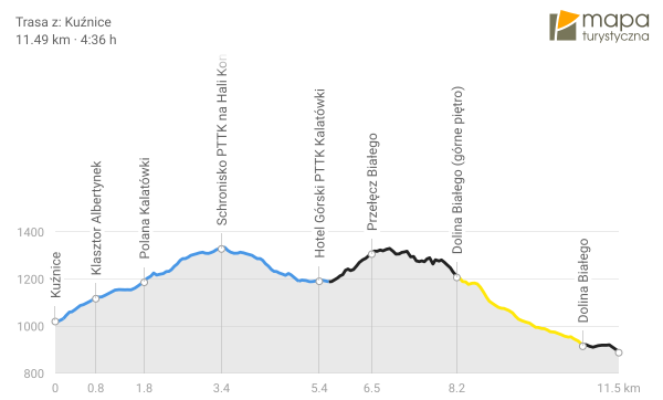 Trasa; Kuźnice – polana Kalatówki – Hala Kondratowa – Hotel Górski Kalatówki – Hala Białe – Dolina Białego – Śnieżny labirynt (jeżeli szlak będzie nieprzedeptany, mamy trasę alternatywną; Kuźnice - Kalatówki - Hala Kondratowa – Kalatówki - Kuźnice)
